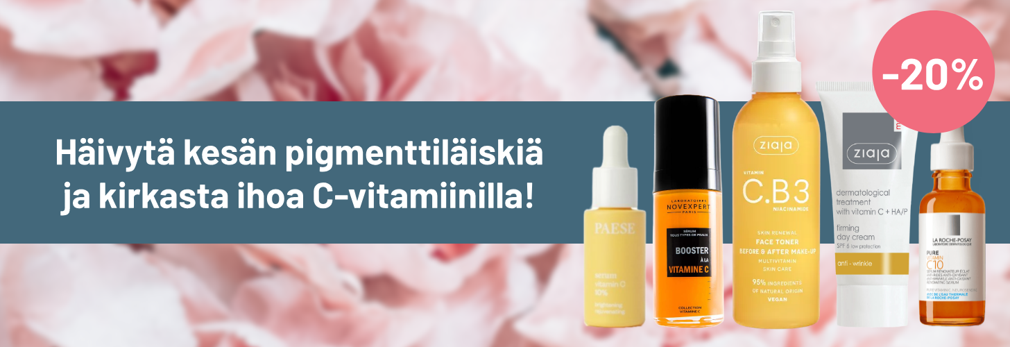 Toiko kesä mukanaan pigmenttiläiskiä? Tasoita ihonsävyä ja kirkasta ihoa C-vitamiinituotteilla! Meiltä löydät laajan valikoiman C-Vitamiiniseerumeita, kasvovoiteita, kasvovesiä sekä kasvo- ja vartalovoiteita. Ihonhoidon C-vitamiinituotteet nyt -20% kauneusviikkojen ajan!